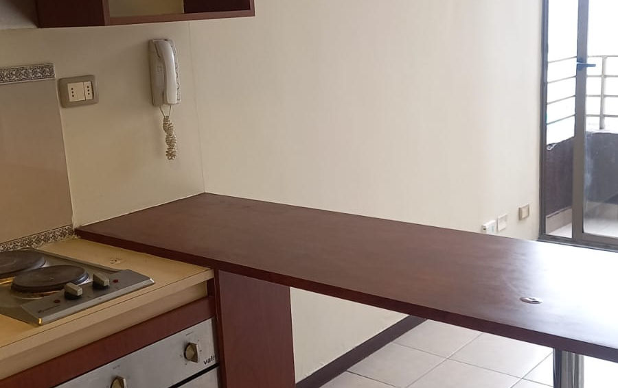Cocina integrada con mesón desayunador , todo el piso del departamento cerámico.